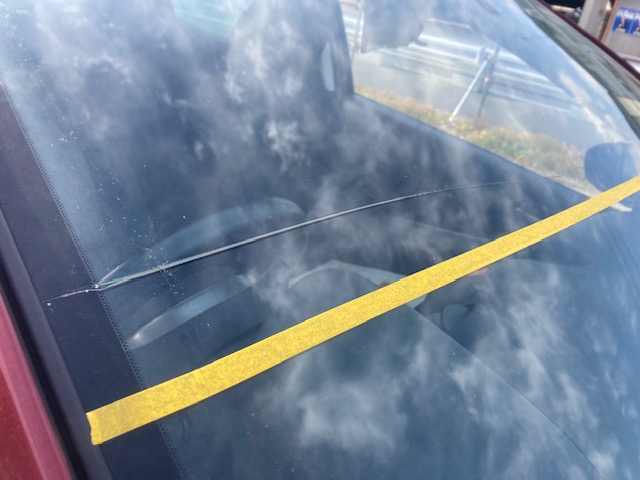 フロントガラスの端側に飛び石が当たり